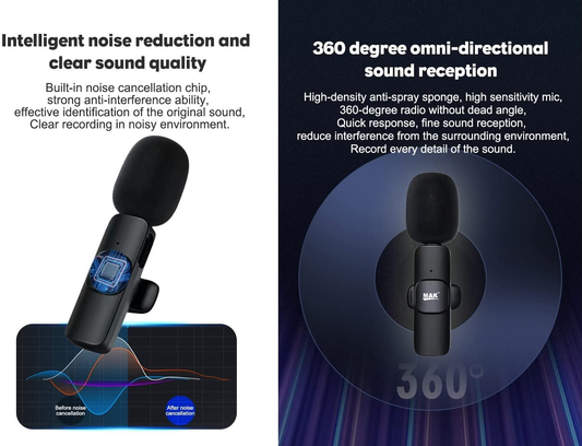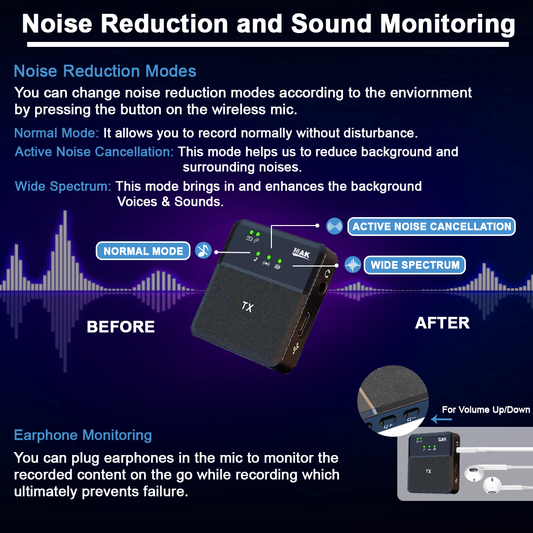 Dual Wireless Lavalier Mic with Noise Reduction Modes Collar Microphone for Mobile, Tablet, Camera, DSLR, BT Speaker