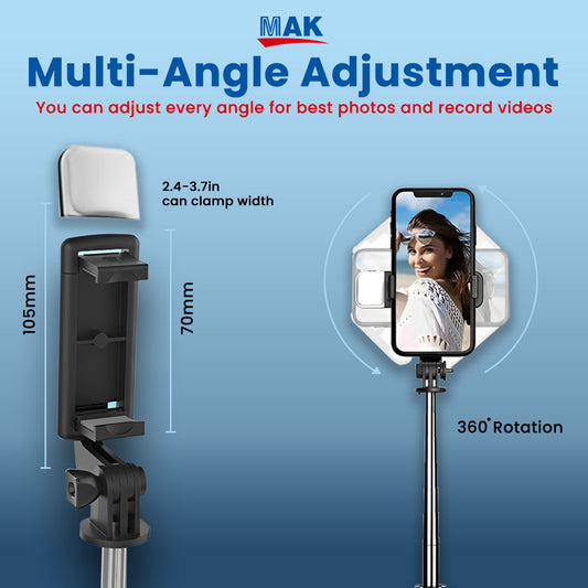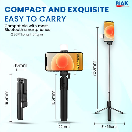 MK-R1S(L) Selfie Stick with Tripod Stand & LED Light, 3 in 1 Multifunctional Design, 67 inch (6 Ft.) Long